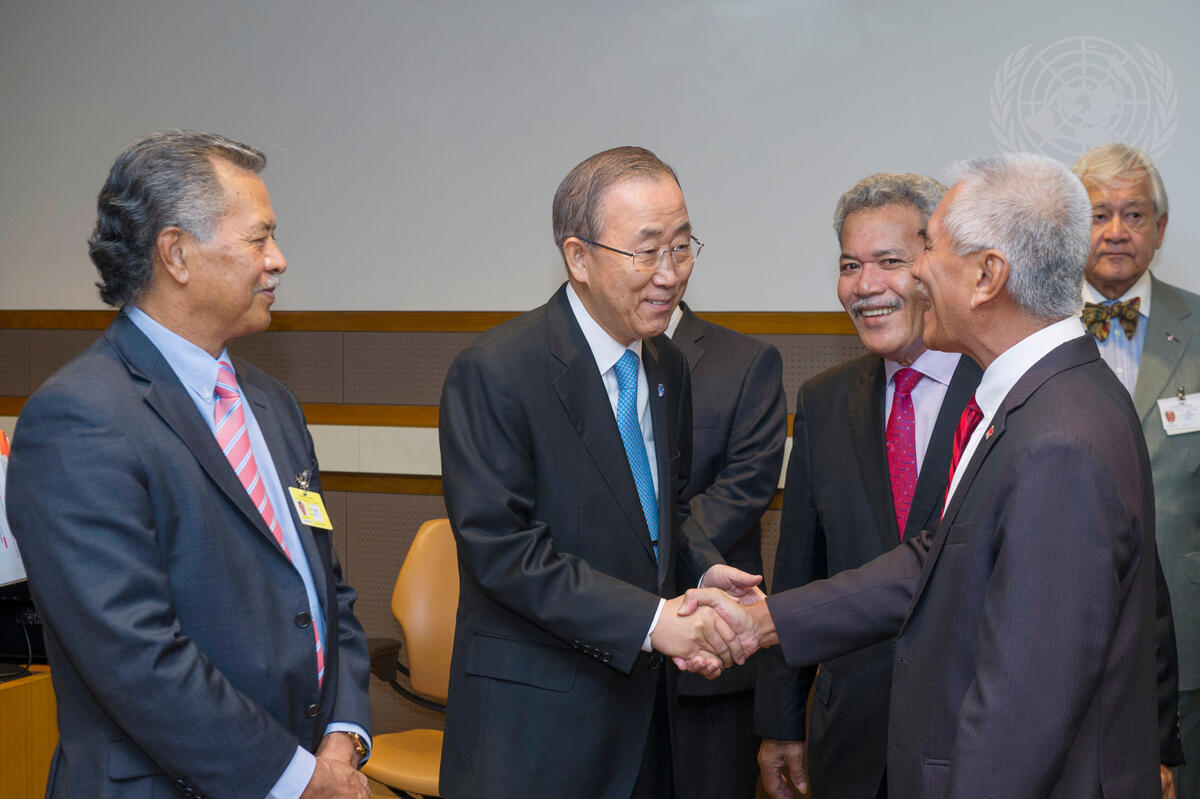 Secretary-General Ban Ki-moon (centre) greets Anote Tong (right), President of the Republic of Kiribati, at a meeting with leaders of the Pacific Islands Forum (PIF). Enele Sosene Sopoaga (centre right), Prime Minister of Tuvalu, looks on. The meeting took place on the margins of the general debate of the sixty-ninth session of the UN General Assembly.