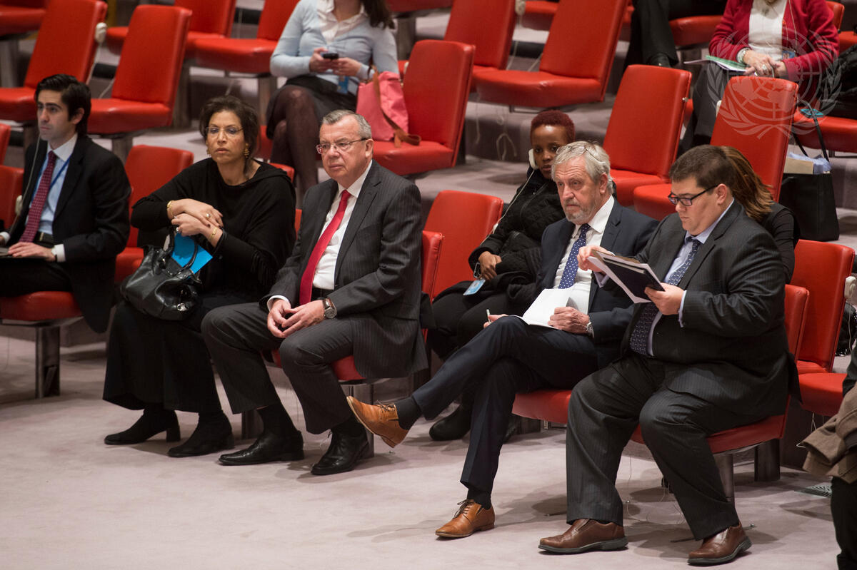 The Security Council met to discuss on the situation in Afghanistan and its implications for international peace and security. Yury Fedotov (centre left), Executive Director of the UN Office on Drugs and Crime (UNODC); and Nicholas Haysom (second from right), Special Representative of the Secretary-General and Head of the United Nations Assistance Mission in Afghanistan (UNAMA), were among the speakers addressing the Council on the subject. They are pictured in the Council Chamber before the meeting began.