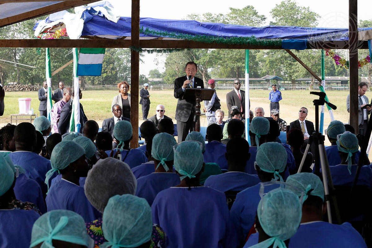Secretary-General Ban Ki-moon (centre at lectern) addresses health workers at the Ebola Treatment Unit PTS1 in Hastings, near Freetown, Sierra Leone.