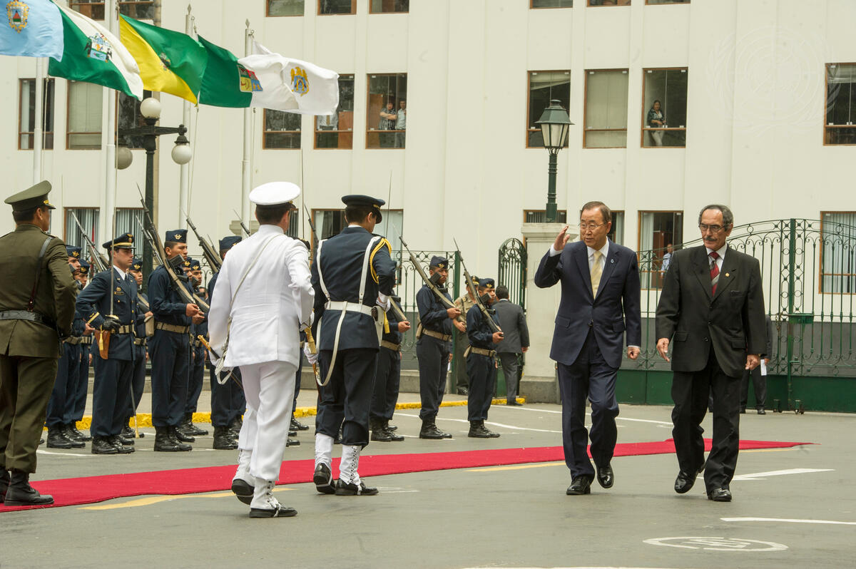 Secretary-General (second from right) during his official visit to Peru. His trip coincides with the UN Climate Change Conference in Lima, which includes the the twentieth session of the UN Framework Convention on Climate Change (UNFCCC) Conference of Parties (COP20) and the tenth session of the Meeting of the Parties to the Kyoto Protocol (CMP 10).