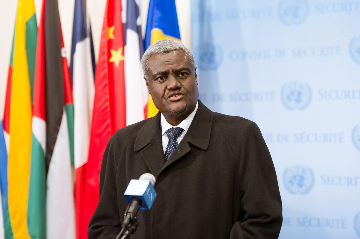 Moussa Faki Mahamat, Minister for Foreign Affairs and African Integration of the Republic of Chad and President of the Security Council for December, speaks to journalists following the Security Council debate on the theme, “Peace operations: The partnership between the United Nations and the African Union and its evolution”.