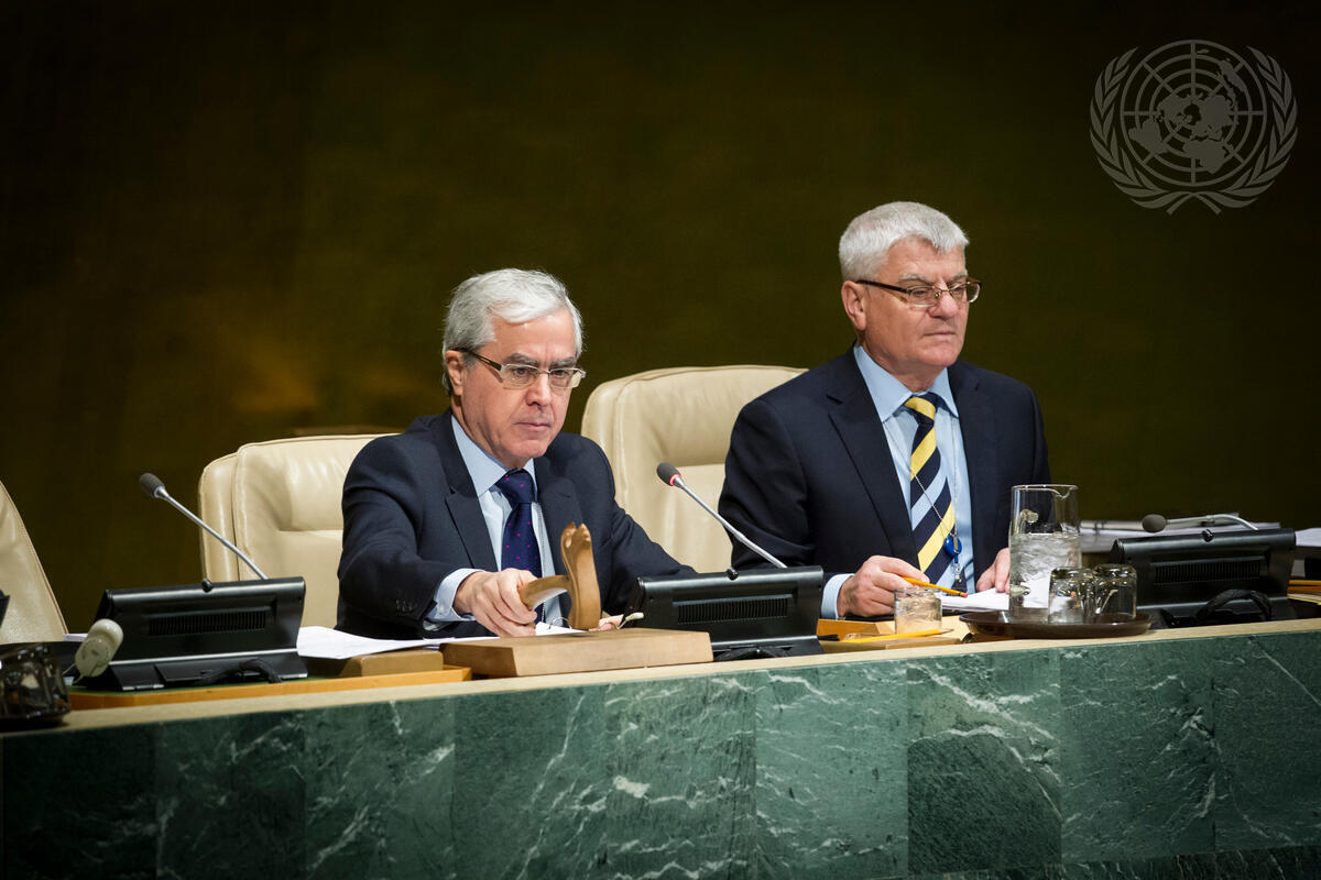 Álvaro José Costa de Mendonça e Moura (left), Permanent Representative of Portugal to the UN and Vice-President of the General Assembly, chairs the Assembly’s meeting on the reports of its Third Committee (Social, Humanitarian and Cultural). At his side is Ion Botnaru, Director of the General Assembly and Economic and Social Council (ECOSOC) Affairs Division.