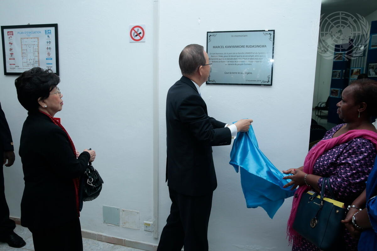 Mr. Ban (centre) unveils a plaque in remembrance of Marcel Rudasingwa, former Ebola Crisis Manager for Guinea, at the entrance of UNMEER headquarters in Conakry, Guinea. Mr. Rudasingwa passed away in November of natural causes. Also pictured are Bintou Keita (right), UNMEER Ebola Crisis Manager for Sierra Leone, and Margaret Chan, Director-General of the World Health Organization (WHO).