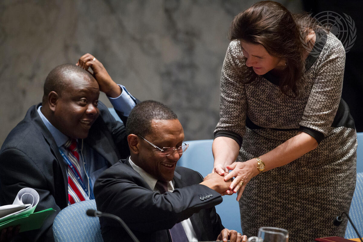 Sylvie Lucas (right), Permanent Representative of Luxembourg to the UN, with Cherif Mahamat Zene, Permanent Representative of the Republic of Chad and Council President for December, at the meeting.