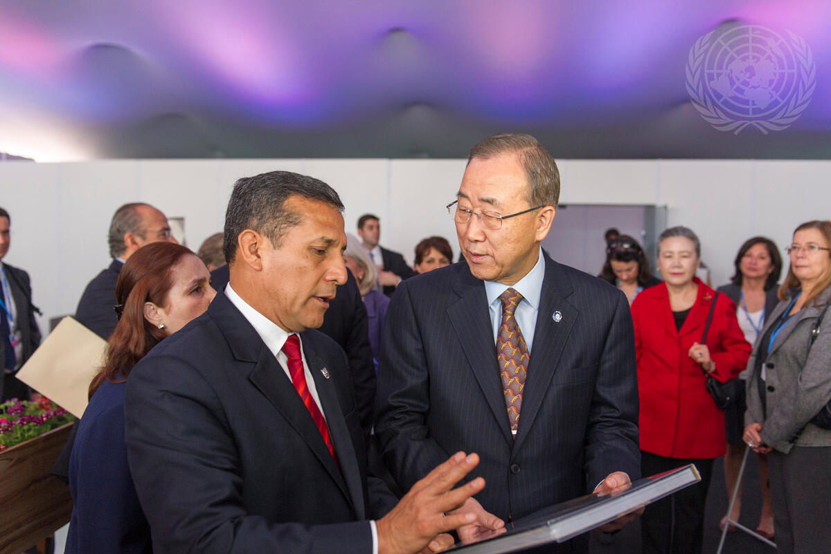 Secretary-General Ban Ki-moon (centre right) speaks with Ollanta Humala (centre left), President of Peru, at the opening of the Lima Climate Action High-level Dialogue. This year's Climate Change Conference in Lima is the twentieth session of the UN Framework Convention on Climate Change (UNFCCC) Conference of the Parties (COP20).