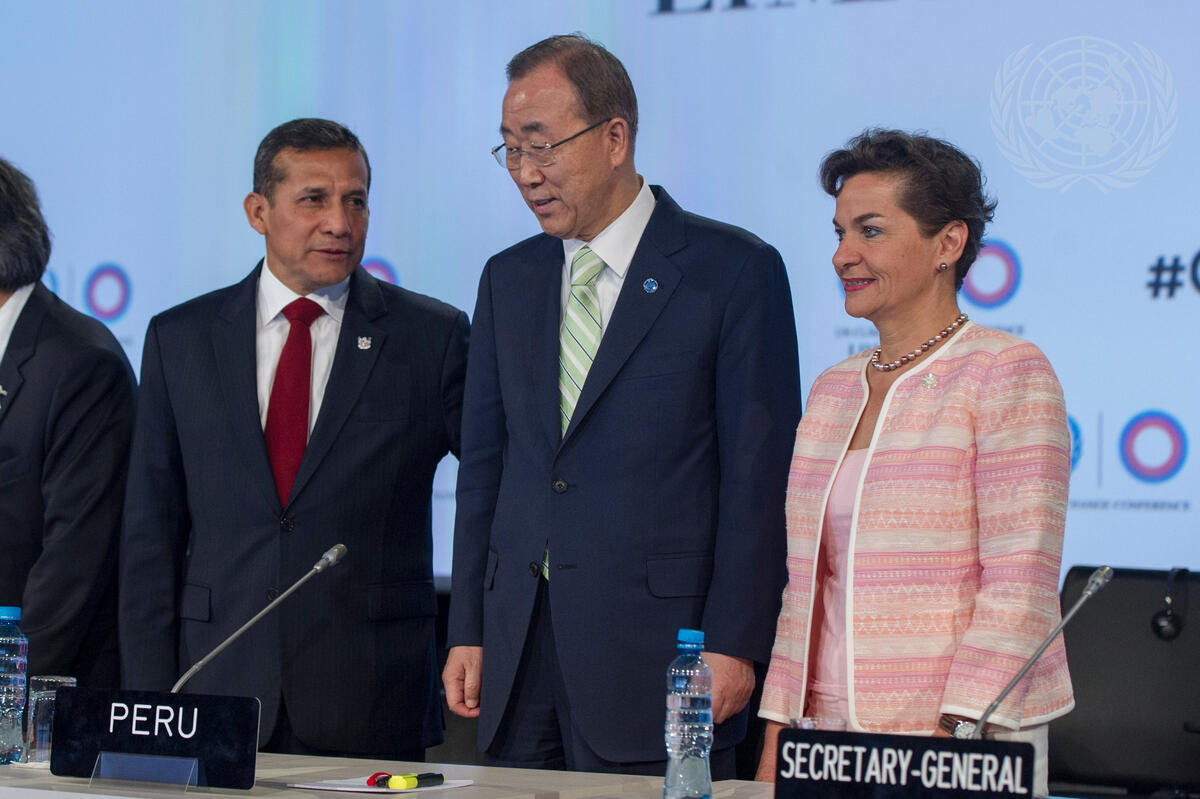 Secretary-General Ban Ki-moon (centre), flanked by Ollanta Humala (left), President of Peru; and Christiana Figueres, Executive Secretary of the UN Framework Convention on Climate Change (UNFCCC), at the Head of State Segment of the UN Climate Change Conference in Lima, Peru.