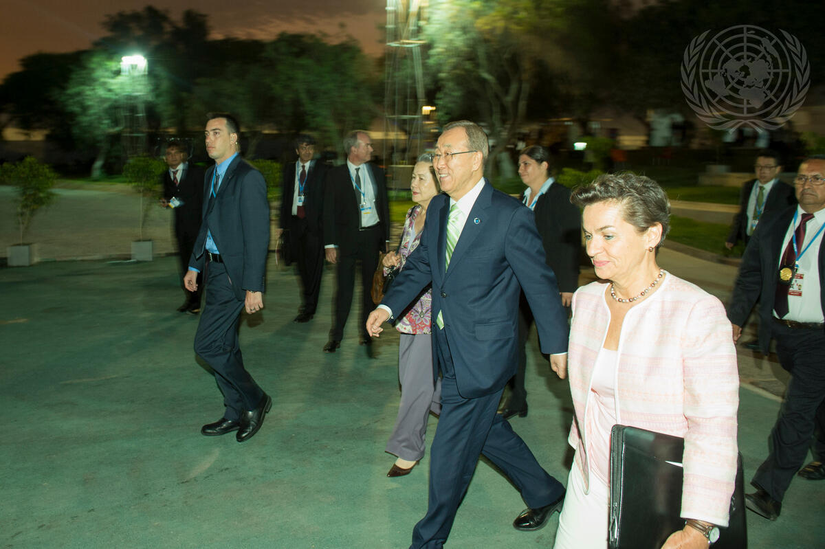 Secretary-General Ban Ki-moon (second from right) arrives to the Head of State Segment at this year's Climate Change Conference in Lima. The conference is the twentieth session of the UN Framework Convention on Climate Change (UNFCCC) Conference of the Parties (COP20). Accompanying Mr. Ban is Christiana Figueres (right), Executive Secretary of the UNFCCC and his wife, Yoo Soon-taek (left).