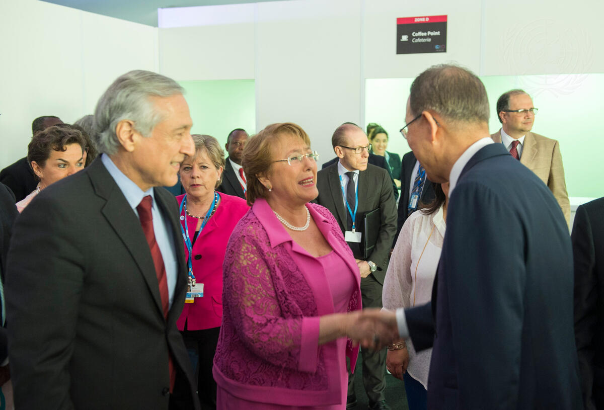 Secretary-General Ban Ki-moon (right) greets Michelle Bachelet Jeria, President of Chile, at the UN Climate Change Conference in Lima, Peru. Also pictured is Heraldo Muñoz (left), former Permanent Representative of Chile to the UN and Director of the UN Development Programme’s (UNDP) Regional Bureau for Latin America and the Caribbean.