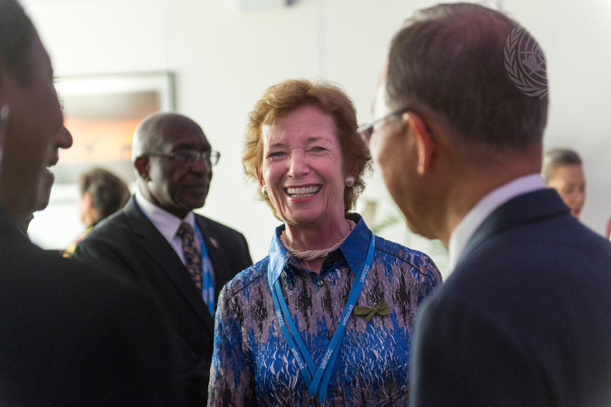 Secretary-General Ban Ki-moon (right) speaks with Mary Robinson, Former President of Ireland and Special Envoy for Climate Change, prior to the opening of the High-Level Segment of the UN Framework Convention on Climate Change (UNFCCC) Conference of the Parties (COP20), taking place in Lima, Peru.