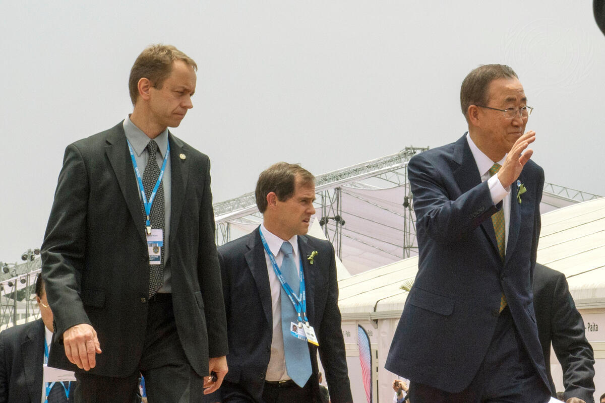 Secretary-General Ban Ki-moon (right) arrives for the opening of a high-level segment of the UN Climate Change Conference taking place in Lima, Peru. Also pictured, Robert Orr (centre), UN Assistant Secretary-General for Strategic Planning. This year's conference is the twentieth session of the UN Framework Convention on Climate Change (UNFCCC) Conference of the Parties (COP20).