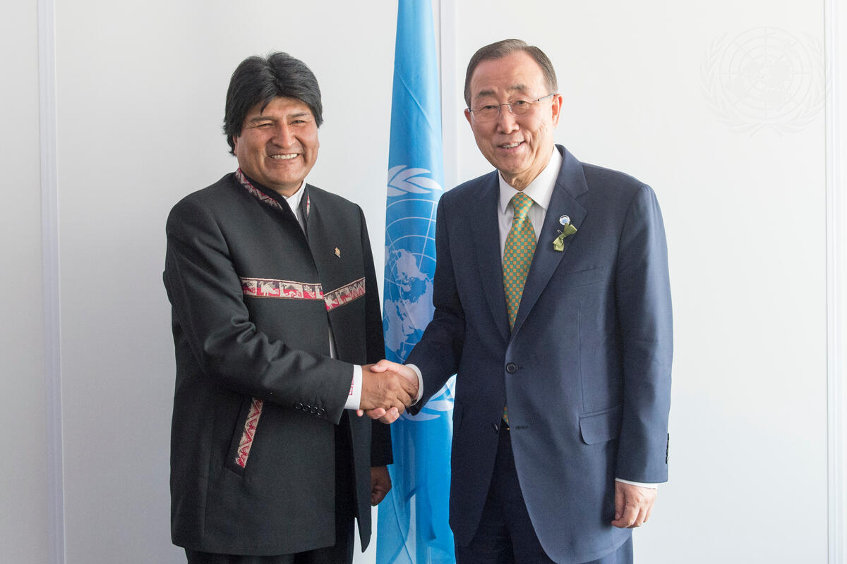 Secretary-General Ban Ki-moon (right) meets with Evo Morales Ayma, President of the Plurinational State of Bolivia, on the margins of the UN Climate Change Conference in Lima, Peru.