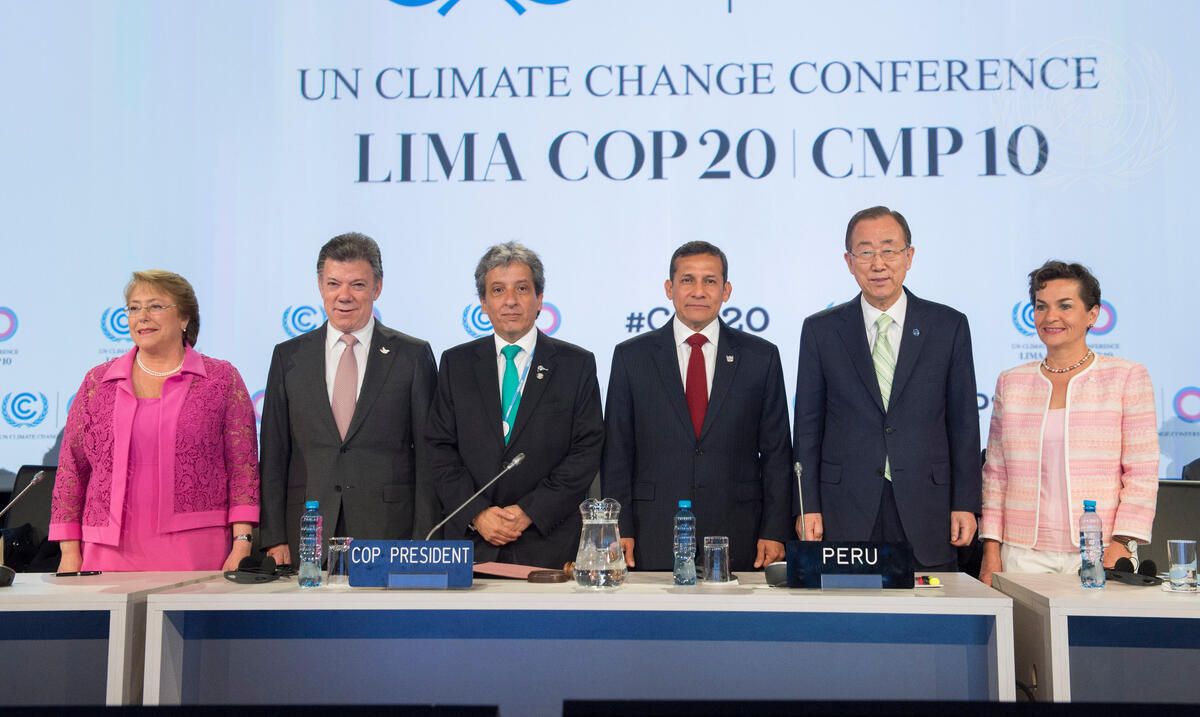 Secretary-General Ban Ki-moon (second from right), flanked by Ollanta Humala (left), President of Peru; and Christiana Figueres, Executive Secretary of the UN Framework Convention on Climate Change (UNFCCC), at the Head of State Segment of the UN Climate Change Conference in Lima, Peru. Also pictured (from left): Michelle Bachelet Jeria, President of Chile; Juan Manuel Santos Calderón, President of Colombia; and Manuel Pulgar-Vidal, Minister of the Environment of Peru and President of the Conference.