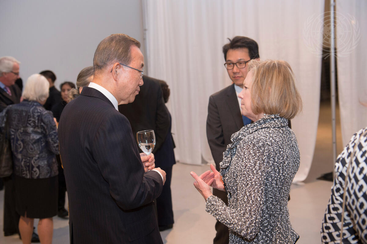Secretary-General Ban Ki-moon (left) speaks with Kathy Calvin, President and Chief Executive Officer of the UN Foundation, at a dinner the Foundation hosted for climate sustainability leaders.