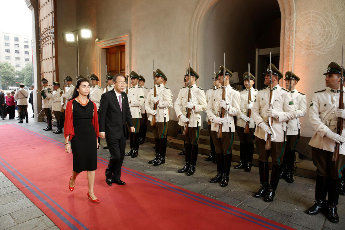 Secretary-General Ban Ki-moon arrives at the presidential palace, “La Moneda”, in Santiago, for his meeting with Michelle Bachelet Jeria, President of Chile.