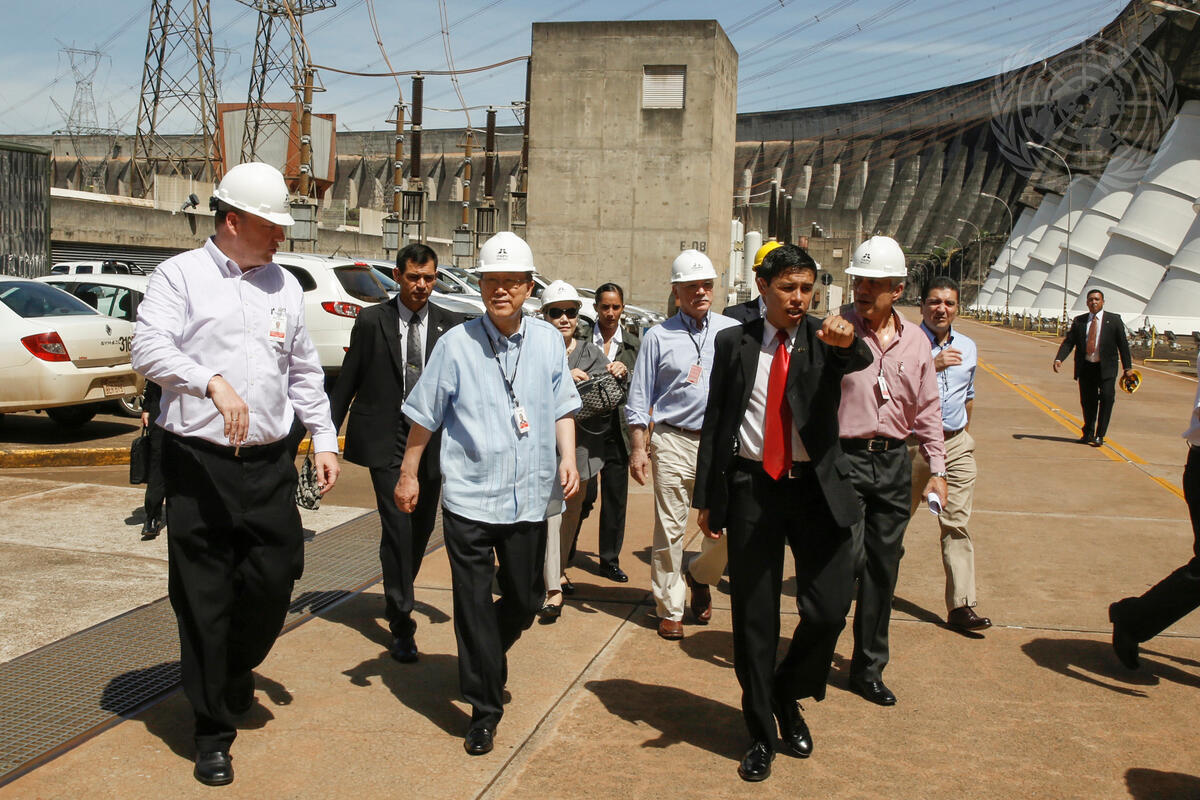 Secretary-General Ban Ki-moon (centre left) visits the Itaipu hydroelectric power plant on the border of Paraguay and Brazil. The plant is a source renewable clean energy for the two countries, providing around 17% of the energy consumed in Brazil and 75% of the energy consumed in Paraguay.