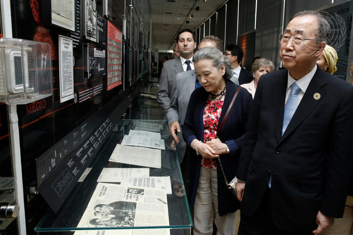 Secretary-General Ban Ki-Moon (right), and his wife Yoo Soon-taek (left) visit the ""Museo de la Memoria y los Derechos Humanos"" in Santiago, Chile.