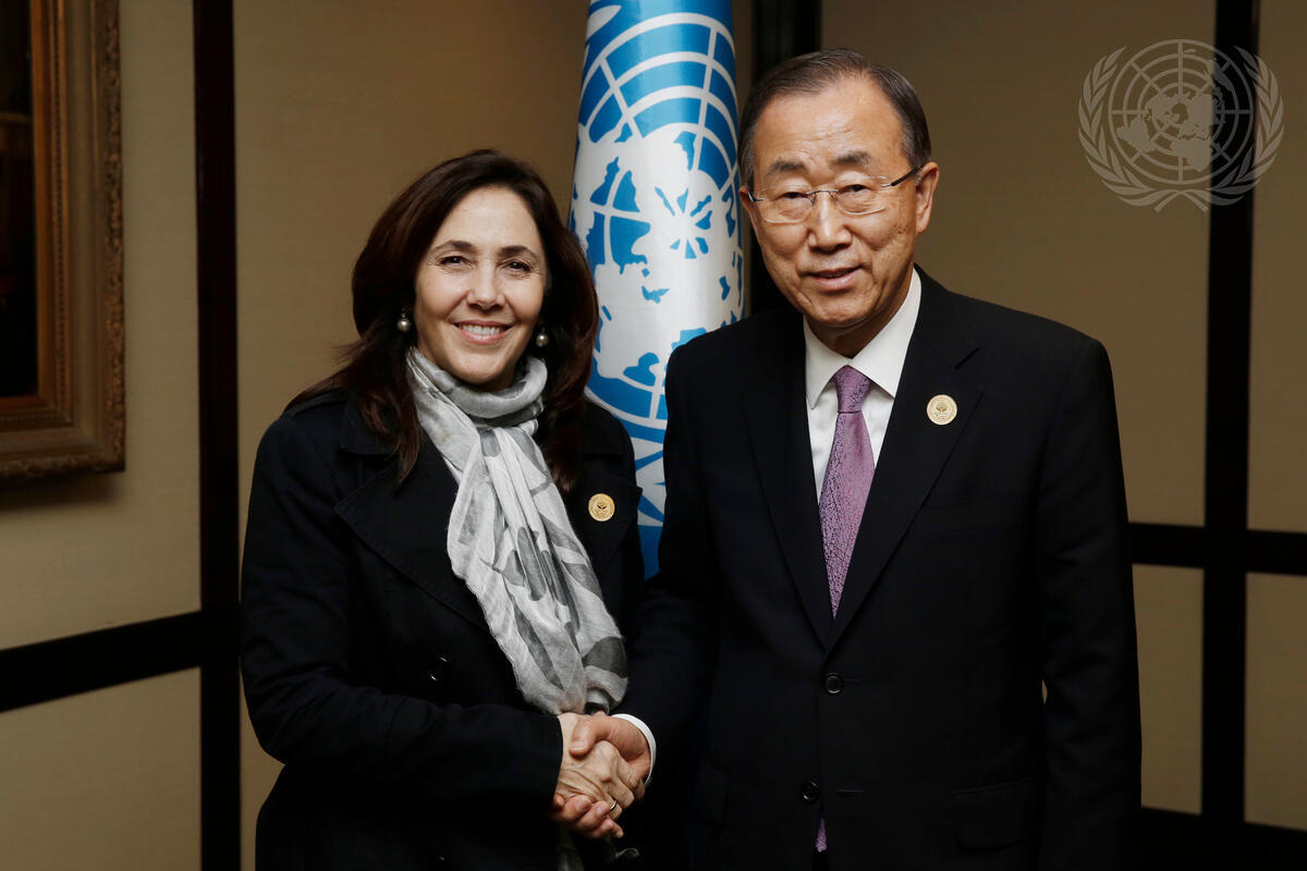 Secretary-General Ban Ki-moon (right) meets with Mariela Castro, Director of the Cuban National Centre for Education, in Santiago during his trip to Chile.