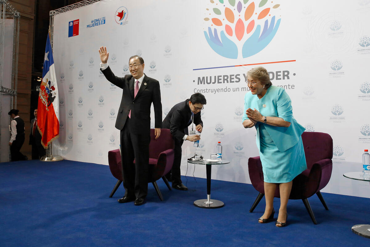 Secretary-General Ban Ki-moon (centre left) with Michelle Bachelet Jeria (right), President of Chile, at the opening session of high-level event on ""Women in Power and Decision Making: Building a Different World"", taking place in Santiago on 27-28 February.