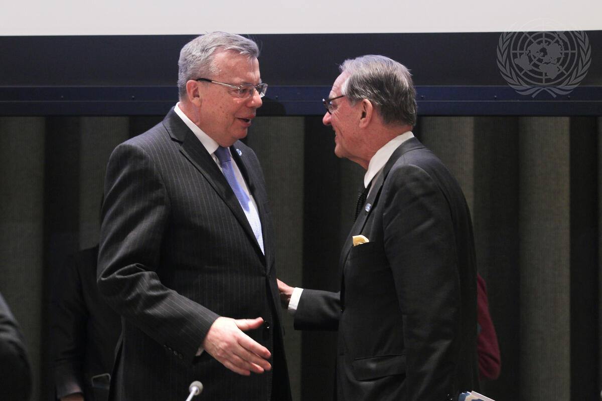 Deputy Secretary-General Jan Eliasson (right) greets Yury Fedotov, Executive Director of the UN Office on Drugs and Crime (UNODC), at the opening session of the General Assembly’s high-level thematic debate on ""Integrating Crime Prevention and Criminal Justice in the Post-2015 Development Agenda"".