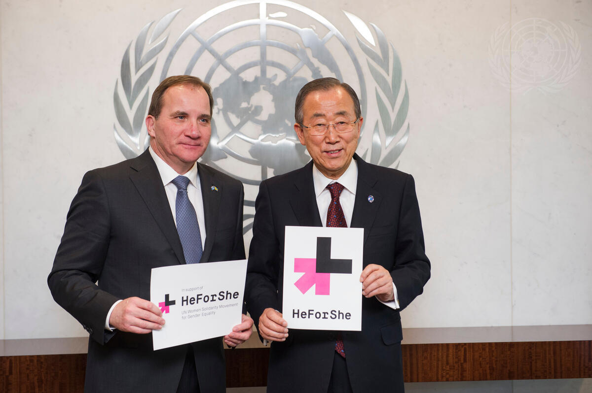 Secretary-General Ban Ki-moon (right) and Stefan Löfven, Prime Minister of Sweden, hold up signs for the HeForShe campaign, a solidarity movement for gender equality launched by the UN Entity for Gender Equality and the Empowerment of Women (UN Women).