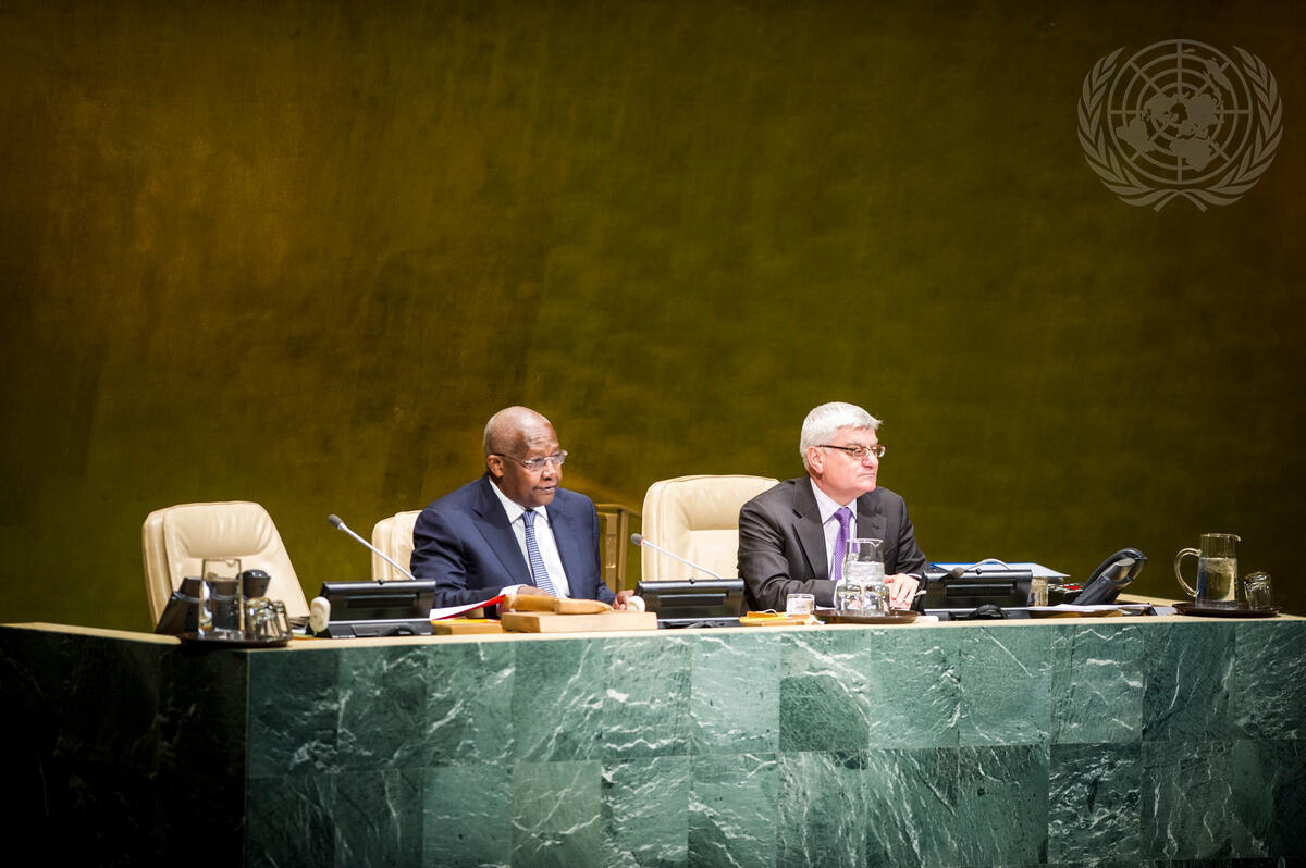 Sam Kahamba Kutesa (left), President of the sixty-ninth session of the Assembly, chairs the igh-level meeting of the General Assembly on the occasion of the twenty-fifth anniversary of the adoption of the Convention on the Rights of the Child. At his side is Ion Botnaru, Director of the General Assembly and Economic and Social Council (ECOSOC) Affairs Division.