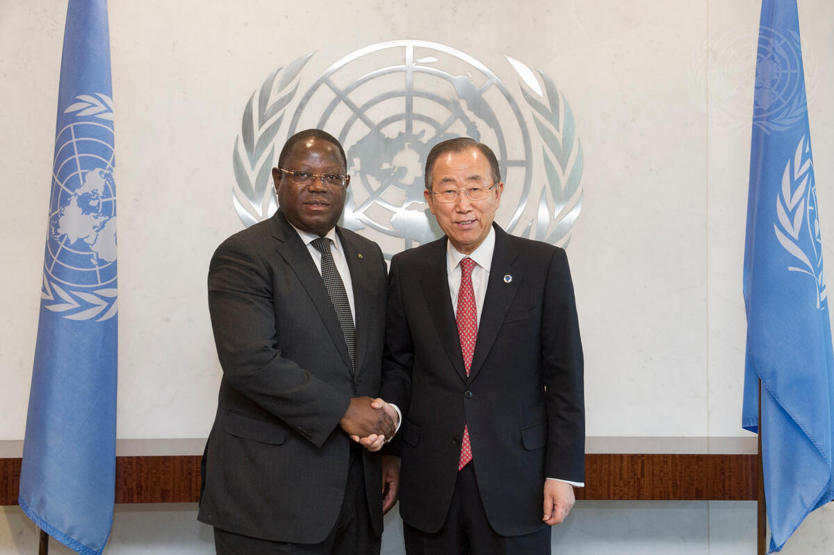 Secretary-General Ban Ki-moon (right) meets with Emmanuel Issoze-Ngondet, Minister for Foreign Affairs of the Gabonese Republic.