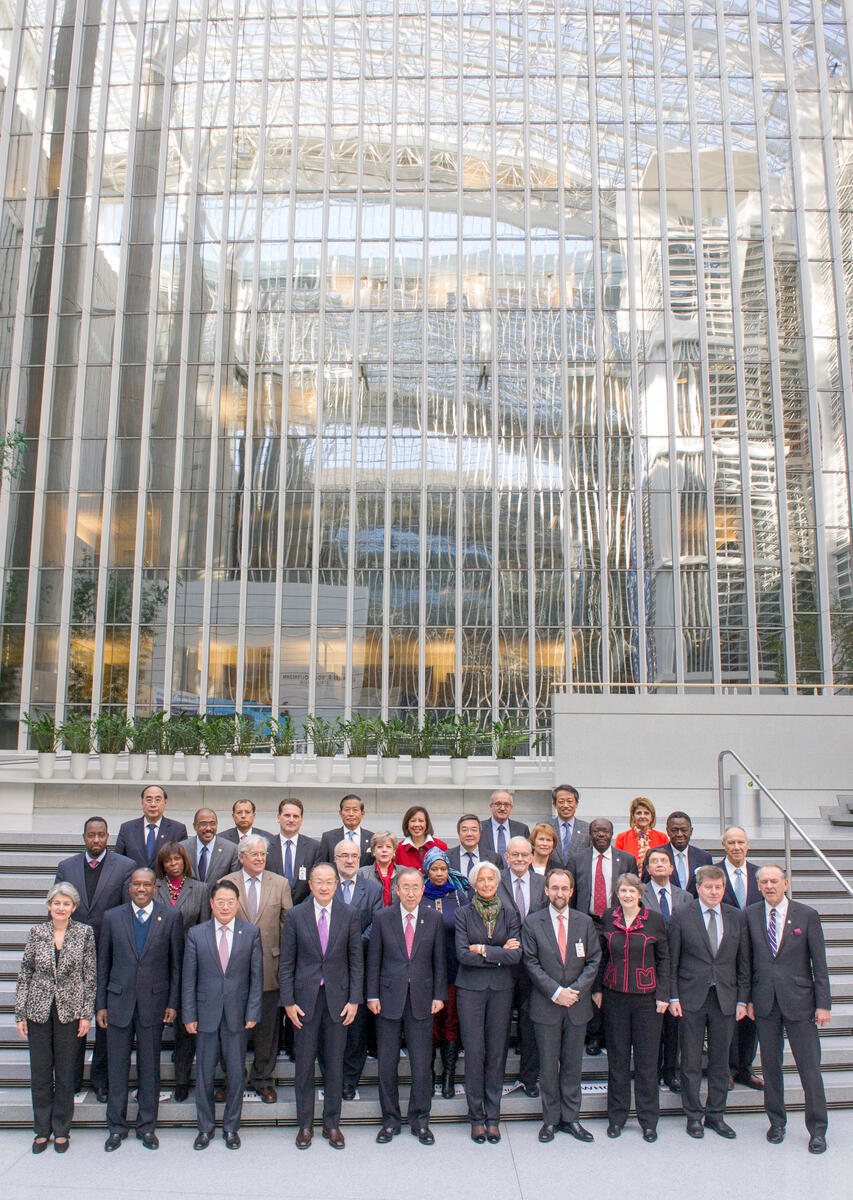 Secretary-General Ban Ki-moon (centre) and the UN Chief Executives Board (CEB) pose for a group photo at the CEB meeting hosted by the World Bank in Washington, D.C. on 20-21 November, 2014. He is flanked on the left by Jim Yong Kim, President of the World Bank Group, and on the right by Christine Lagarde, Managing Director of the International Monetary Fund (IMF).