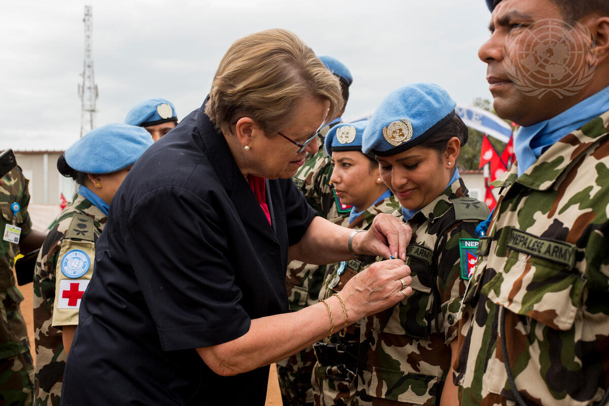 Ellen Margrethe Løj, Special Representative of the Secretary-General and Head of the United Nations Mission in South Sudan (UNMISS), awards a UN Medals to members of the Nepalese battalion serving with UNMISS.