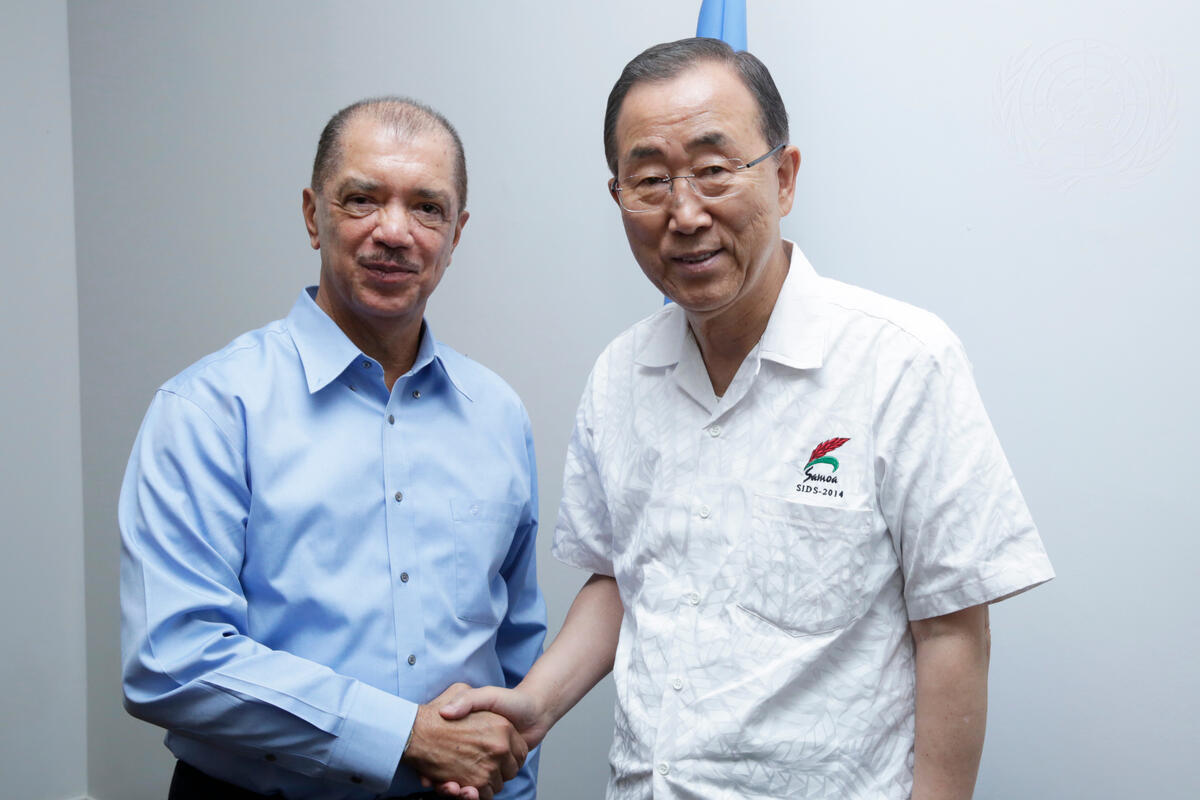 Secretary-General Ban Ki-moon (right) meets with James A. Michel, President of the Republic of Seychelles in Apia, Samoa.