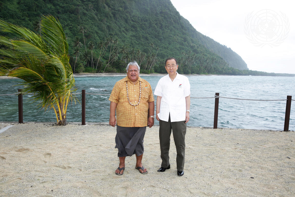 Secretary-General Ban Ki-moon (right) with Tuilaepa Sailele Malielegaoi, Prime Minister of the Independent State of Samoa, during a site visit to Si’upapa and a displaced community struck by a tsunami nearly five years ago.