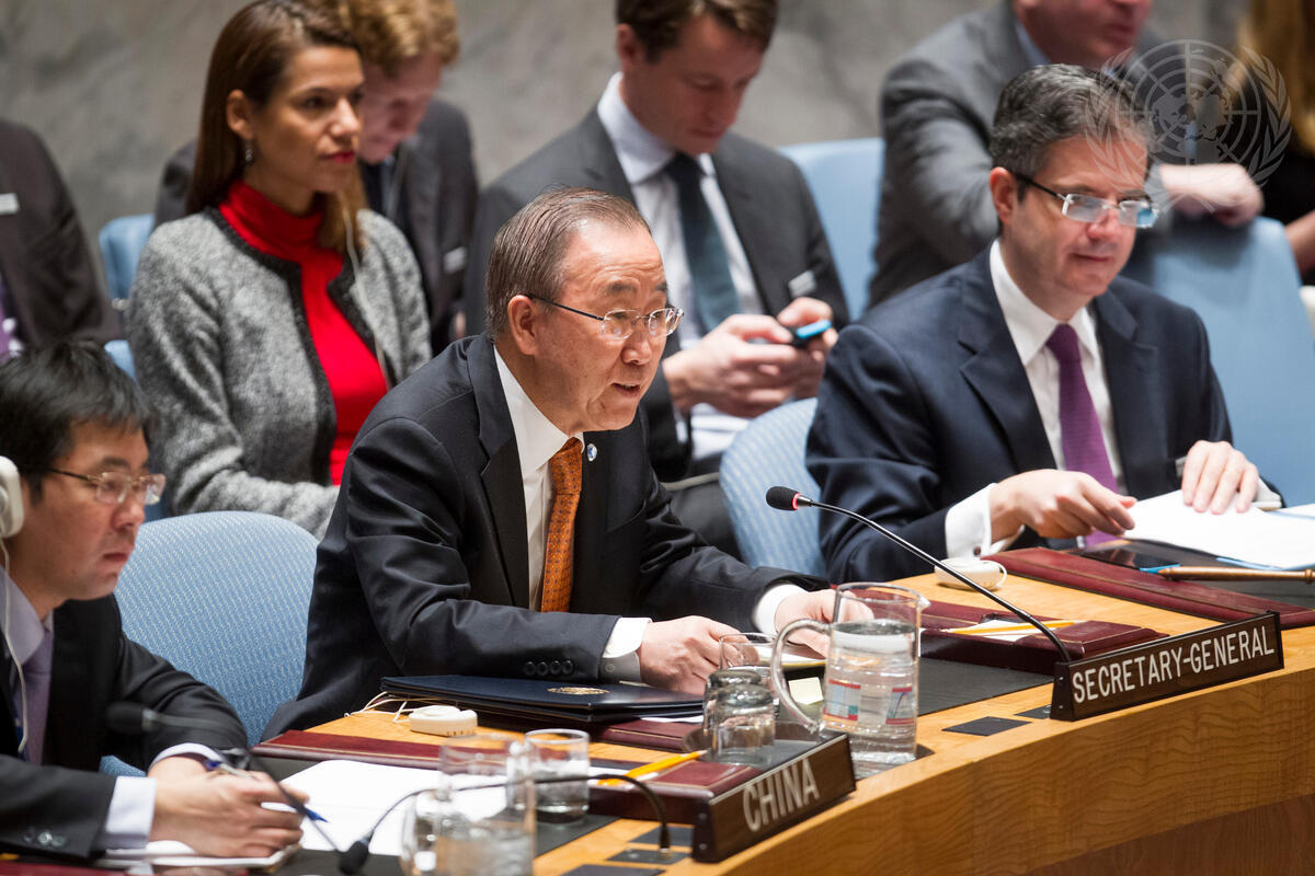 Secretary-General Ban Ki-moon (centre) addresses the Security Council open debate on children and armed conflict, which focused in particular on child victims of non-State armed groups. At right is François Delattre, Permanent Representative of France to the UN and President of the Security Council for the month of March.