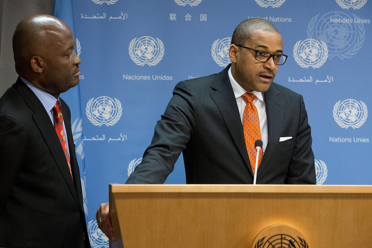 Courtenay Rattray (right), Permanent Representative of Jamaica to the UN, addresses a press conference on the occasion of the International Day of Remembrance of Victims of Slavery and the Transatlantic Slave Trade (25 March). The press conference was moderated by Jean-Victor Nkolo (left), Spokesperson for the President of the General Assembly.