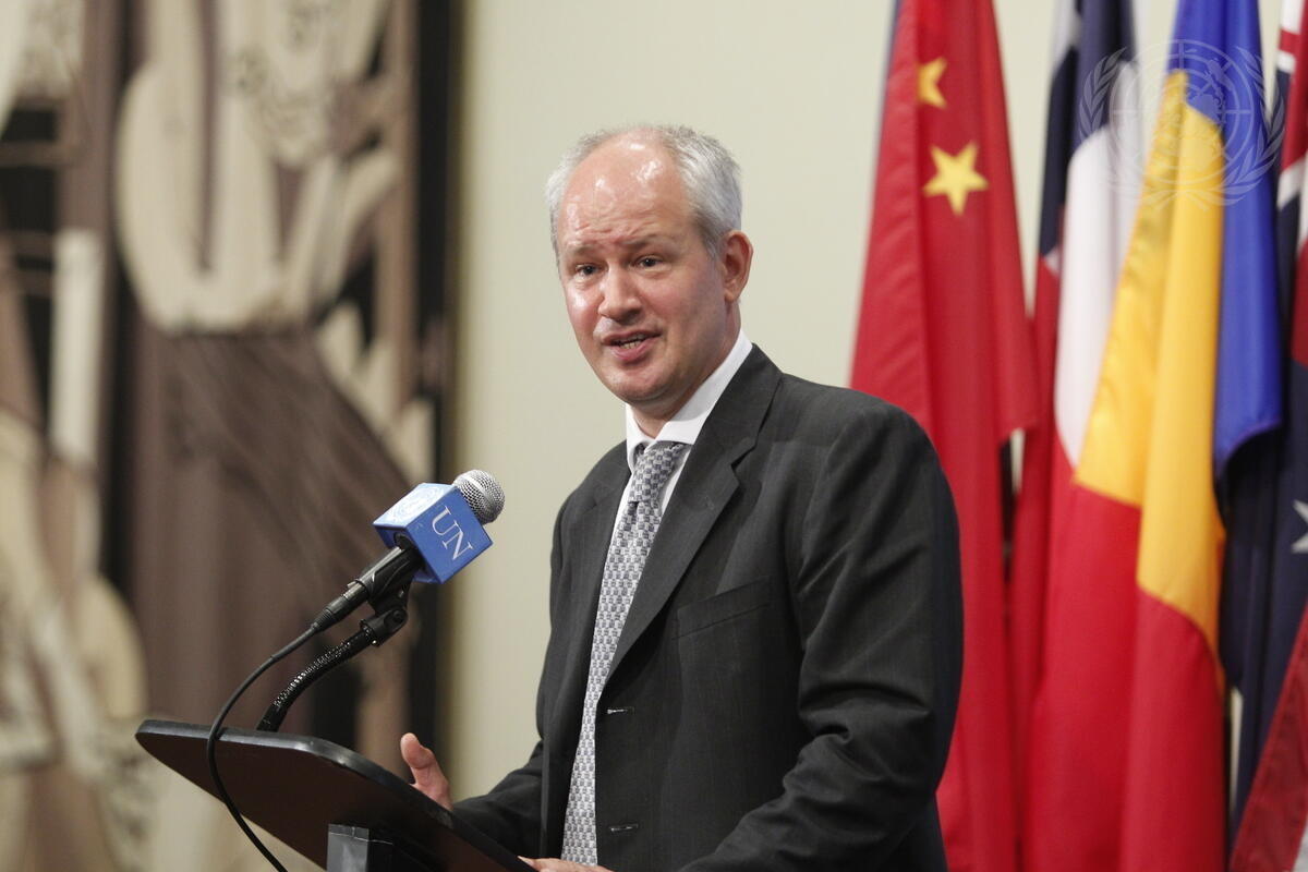 Peter Wilson, Deputy Permanent Representative of the United Kingdom to the UN, briefs journalists following a closed-door Security Council meeting on the situation in Guinea Bissau. He also spoke on the UN Interim Force in Lebanon (UNIFIL), the Democratic Republic of the Congo and Gaza. The United Kingdom holds the rotating Council presidency for the month of August.