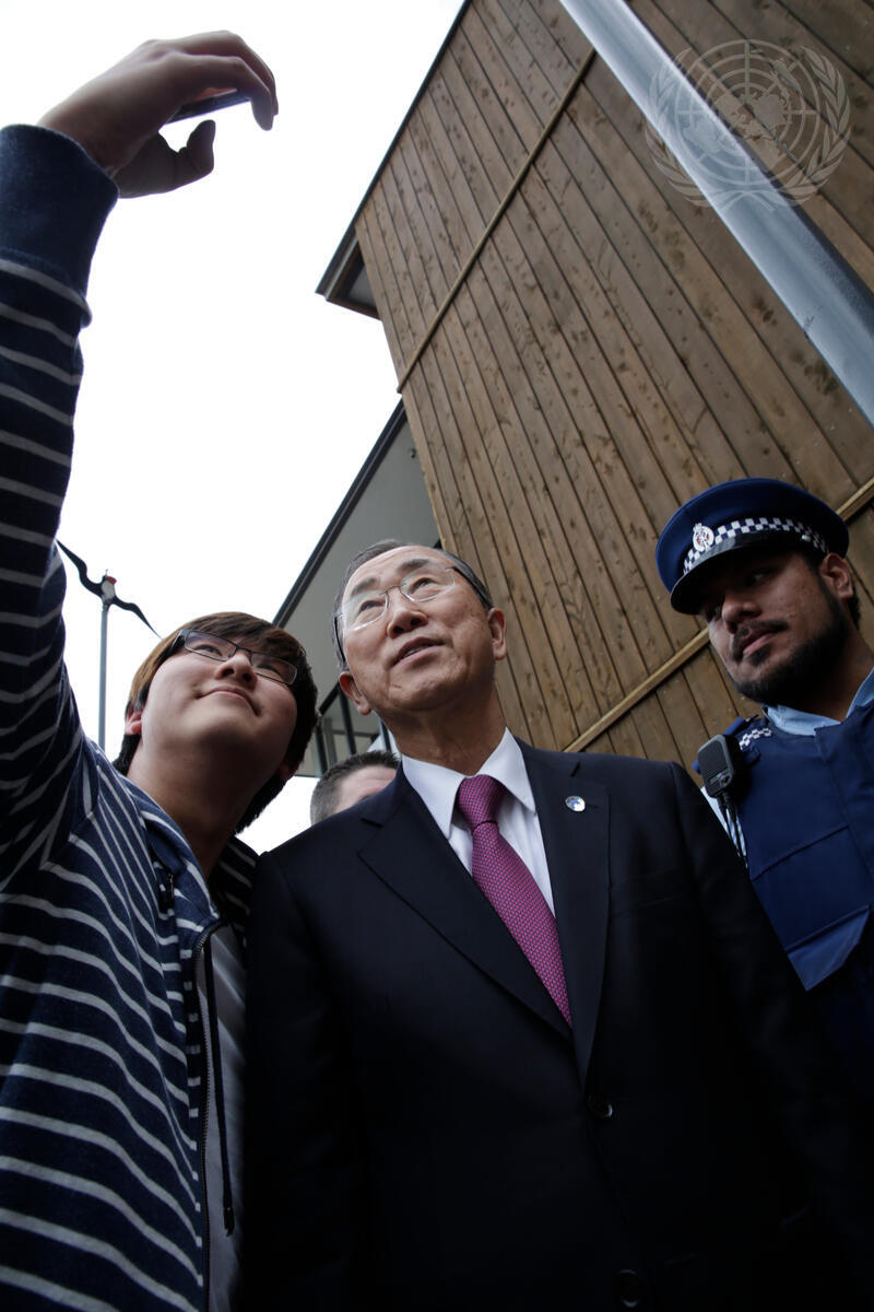 Secretary-General Ban Ki-moon poses for a ""selfie"" with a student at the University of Auckland where he was bestowed at Honorary Doctor of Laws degree in recognition of his role as an international statesman and his past engagement with the University.