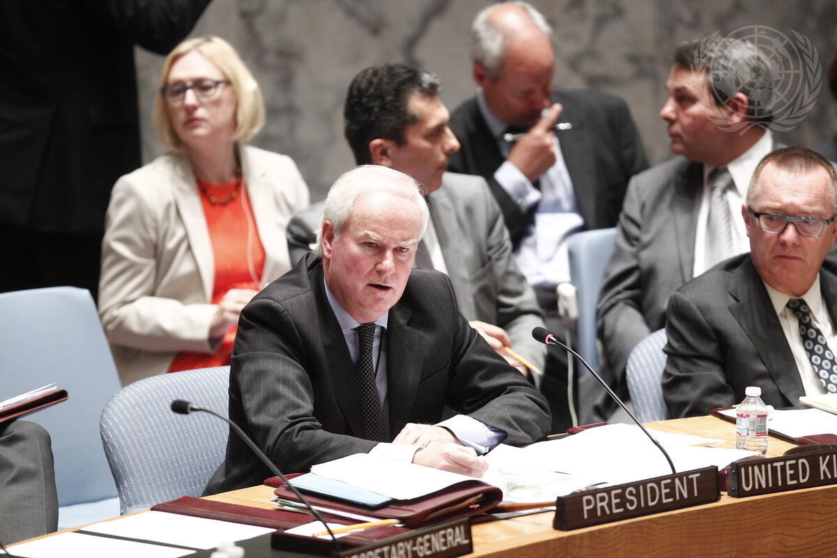 Mark Lyall Grant, Permanent Representative of the United Kingdom to the UN and President of the Security Council for the month of August, addresses the Security Council meeting on the situation in Ukraine.