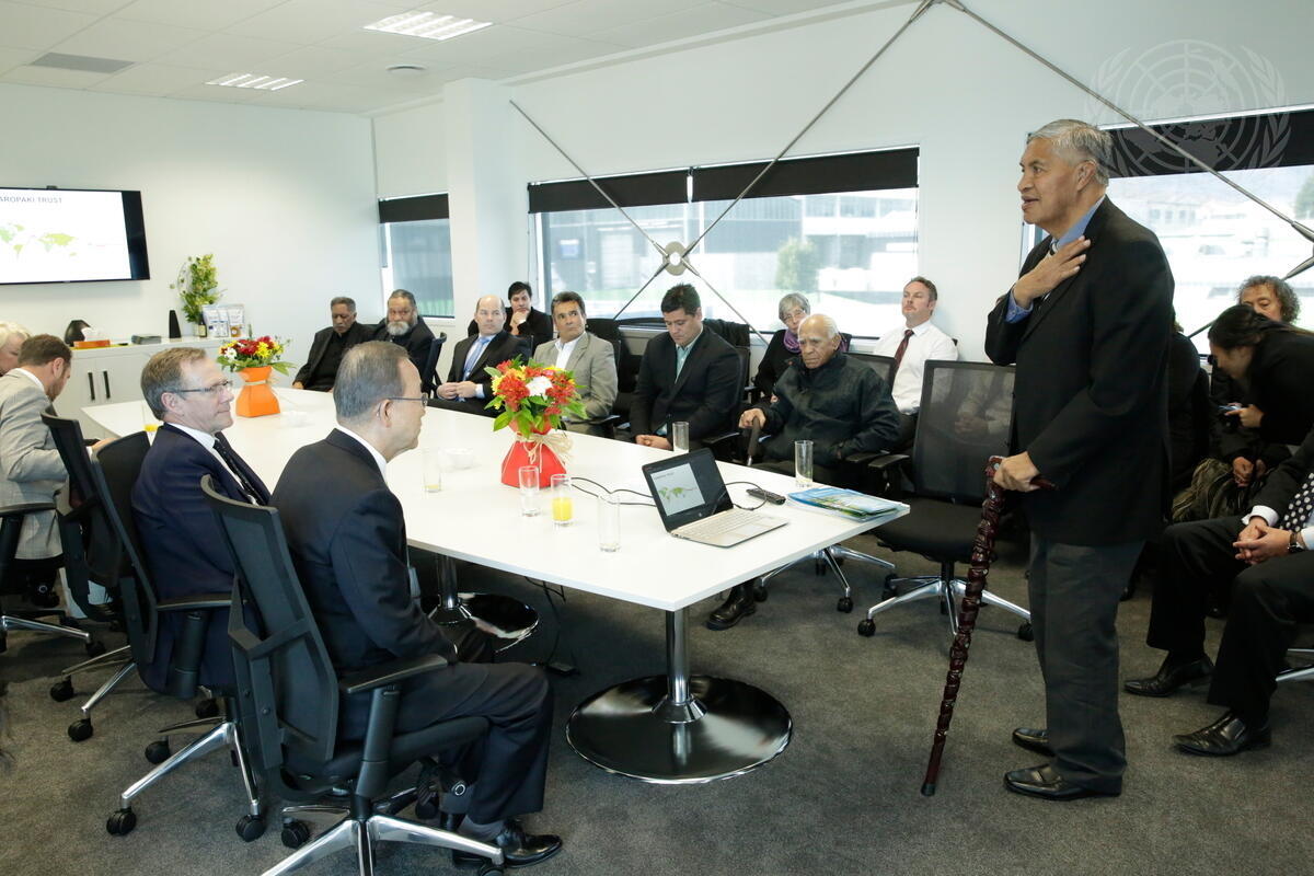 Secretary-General Ban Ki-moon (seated, left of computer) listens to the tradition ""powhiri"" welcome at the Tuaropaki head office. The visit included a presentation on the Tuaropaki sustainability, energy and agricultural business models.