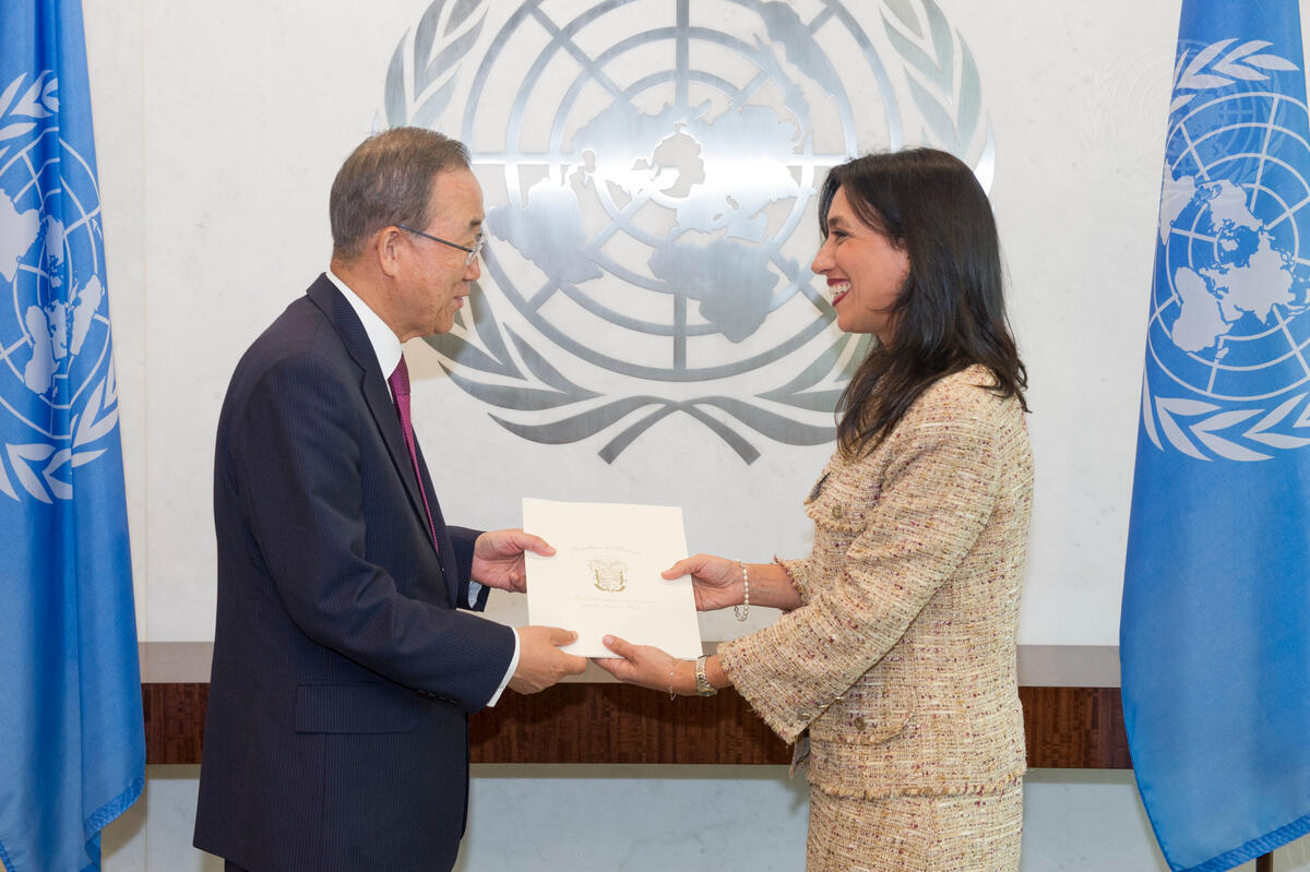 Laura Elena Flores Herrera (right), new Permanent Representative of Panama to the United Nations, presents her credentials to Secretary-General Ban Ki-moon.
