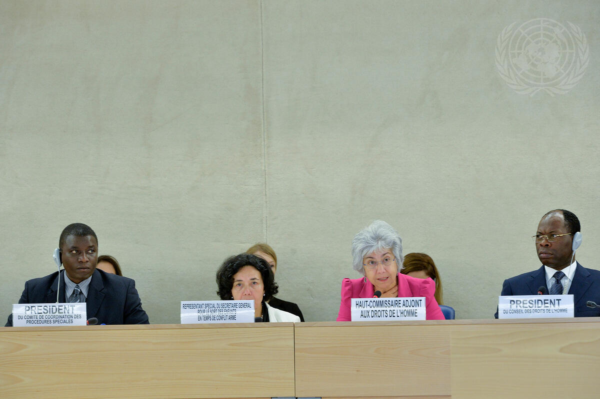 Flavia Pansieri (centre right), UN Deputy High Commissioner for Human Rights addresses a special session of the Human Rights Council on Iraq. She is flanked by Leila Zerrougui (left), Special Representative of the Secretary-General for Children and Armed Conflict; and Baudelaire Ndong Ella, President of the Human Rights Council. Also pictured, Chaloka Beyani, Chair of the Coordination Committee of Human Rights Special Procedures and Special Rapporteur on the human rights of internally displaced persons (IDPs).
