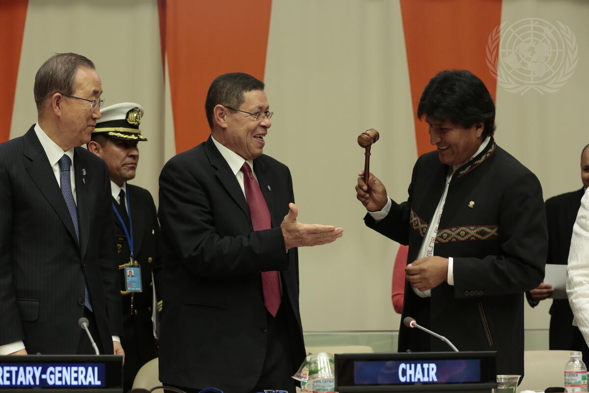 Evo Morales Ayma (right), President of the Plurinational State of Bolivia, hands over the gavel to Luwellyn Landers, Deputy Minister of International Relations and Cooperation of the Republic of South Africa, at the at the ceremony marking the change of Chairmanship of the Group of 77. Looking on is UN Secretary-General Ban Ki-moon (left).