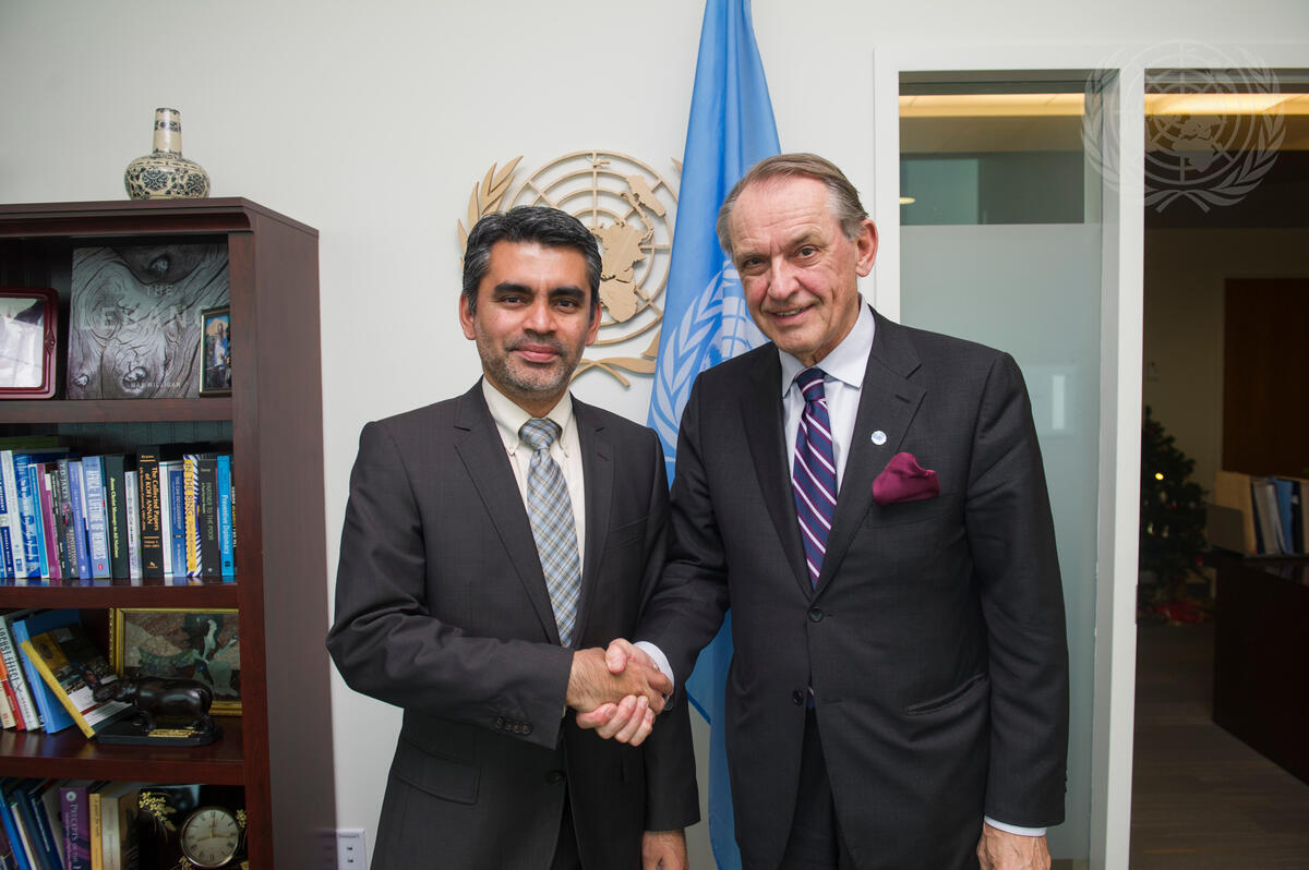 Kul Zanofer Ismalebbe (left), member of the Executiv Office of the Secretary-General, pays a farewell call on Deputy Secretary-General Jan Eliasson.