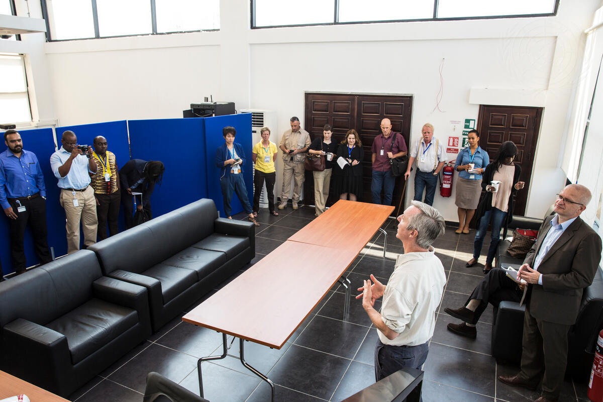 Anthony Banbury (second from right, foreground), Special Representative of the Secretary-General and Head of the UN Mission for Ebola Emergency Response (UNMEER), speaks to UN staff in Monrovia, Liberia.