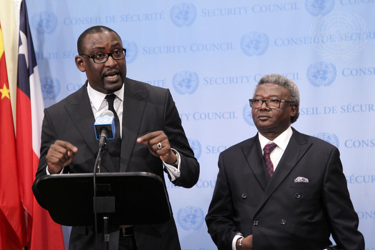 Abdoulaye Diop (left), Minister for Foreign Affairs and International Cooperation of the Republic of Mali, speaks to journalists following a closed-door Security Council meeting on the United Nations Multidimensional Integrated Stabilization Mission in his country (MINUSMA). Pictured at right is Sékou Kassé, Permanent Representative of the Republic of Mali to the UN.