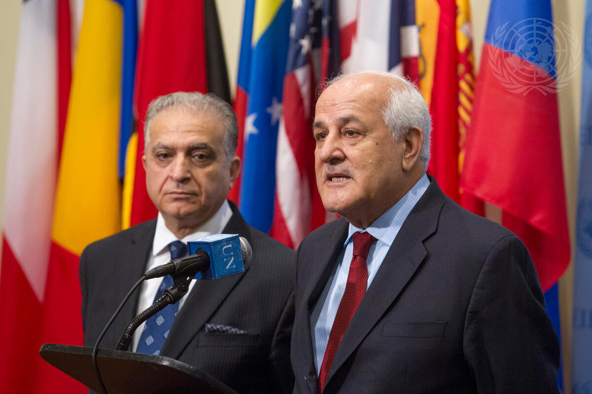 Riyad H. Mansour (right), Permanent Observer of the State of Palestine to the UN, speaks to journalists, following a Security Council meeting to discuss the tense situation in Jerusalem as a result of a series of violent incidents at the site of the al-Aqsa Mosque. Also addressing the press with him was Mohamed Ali Alhakim, Permanent Representative of Iraq to the UN.