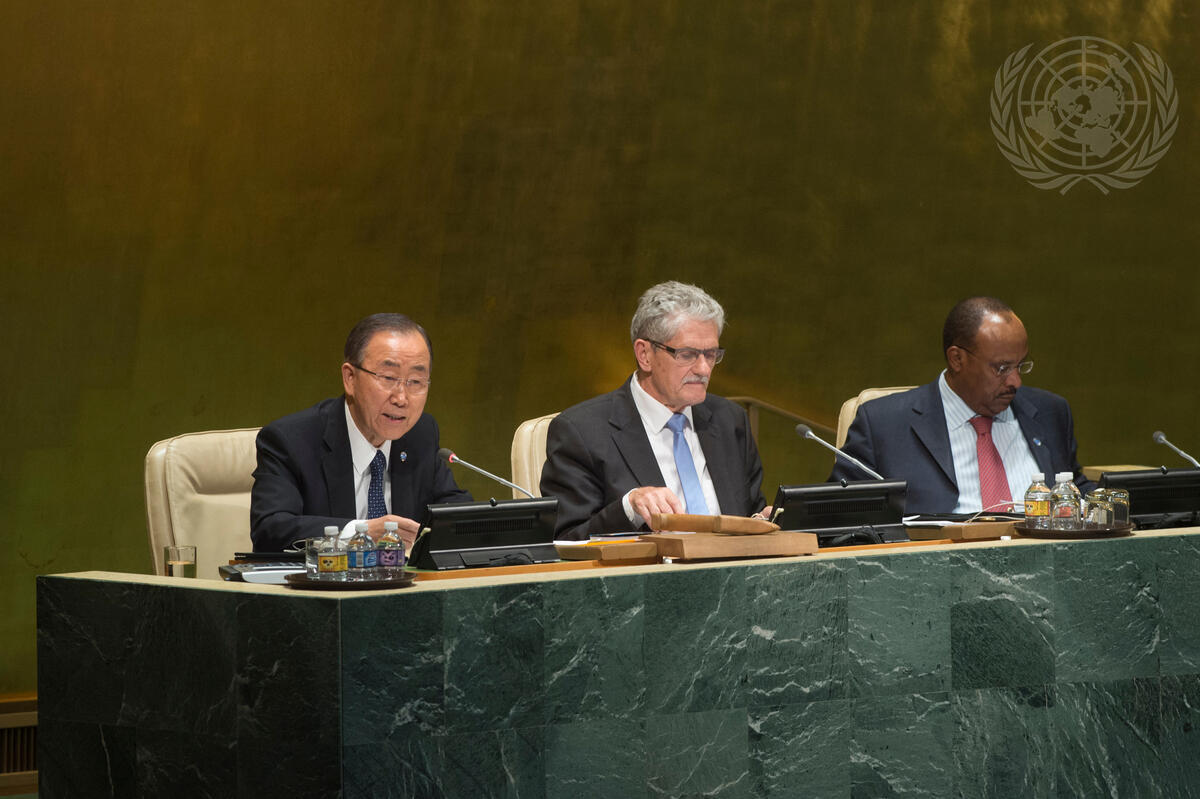 Secretary-General Ban Ki-moon (left), addresses the opening meeting of the General Assembly’s seventieth session. Also pictured: Mogens Lykketoft (centre), President of the Assembly; and Tegegnework Gettu, Under-Secretary-General for General Assembly and Conference Management.