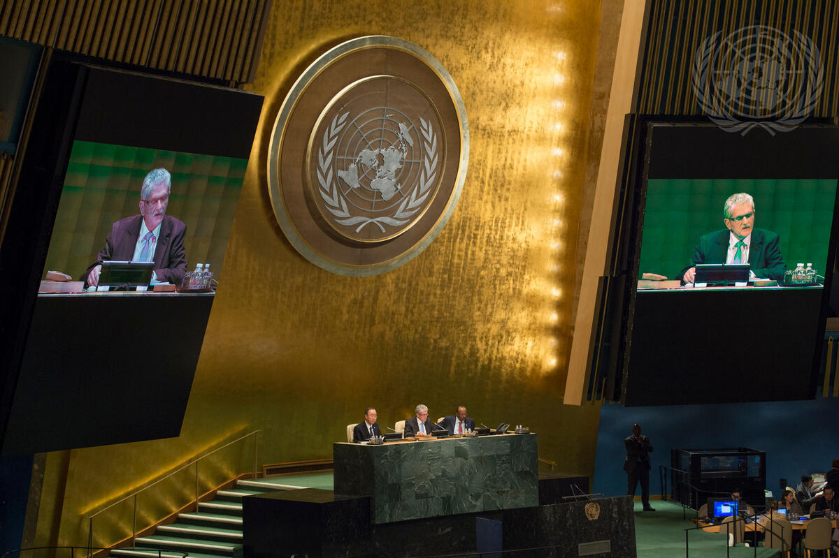 Mogens Lykketoft (shown on screens), President of the seventieth session of the General Assembly, addresses the first meeting of the Assembly’s new session.