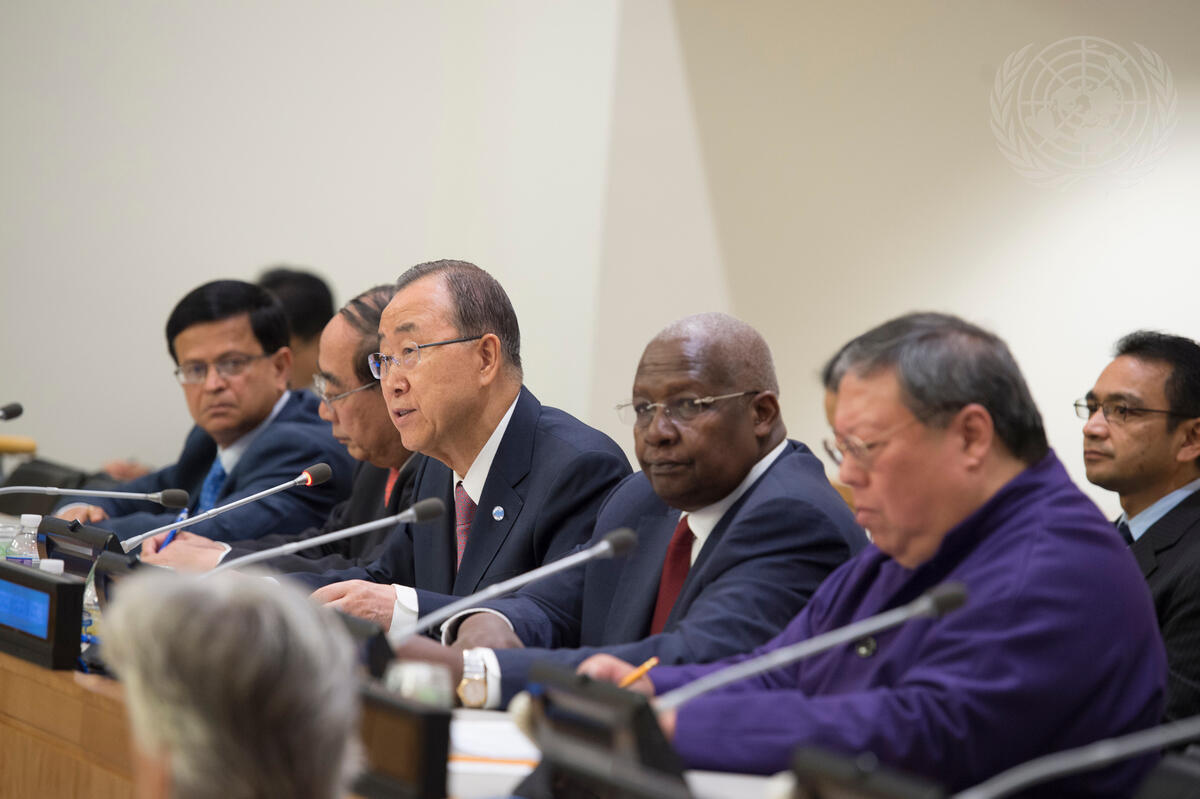 Secretary-General Ban Ki-moon (centre) speaks at today's award ceremony. To his left are Sam Kutesa (second from right), President of the sixty-ninth session of the General Assembly and Patrick Ho (far right), Secretary-General of the CEFC.
