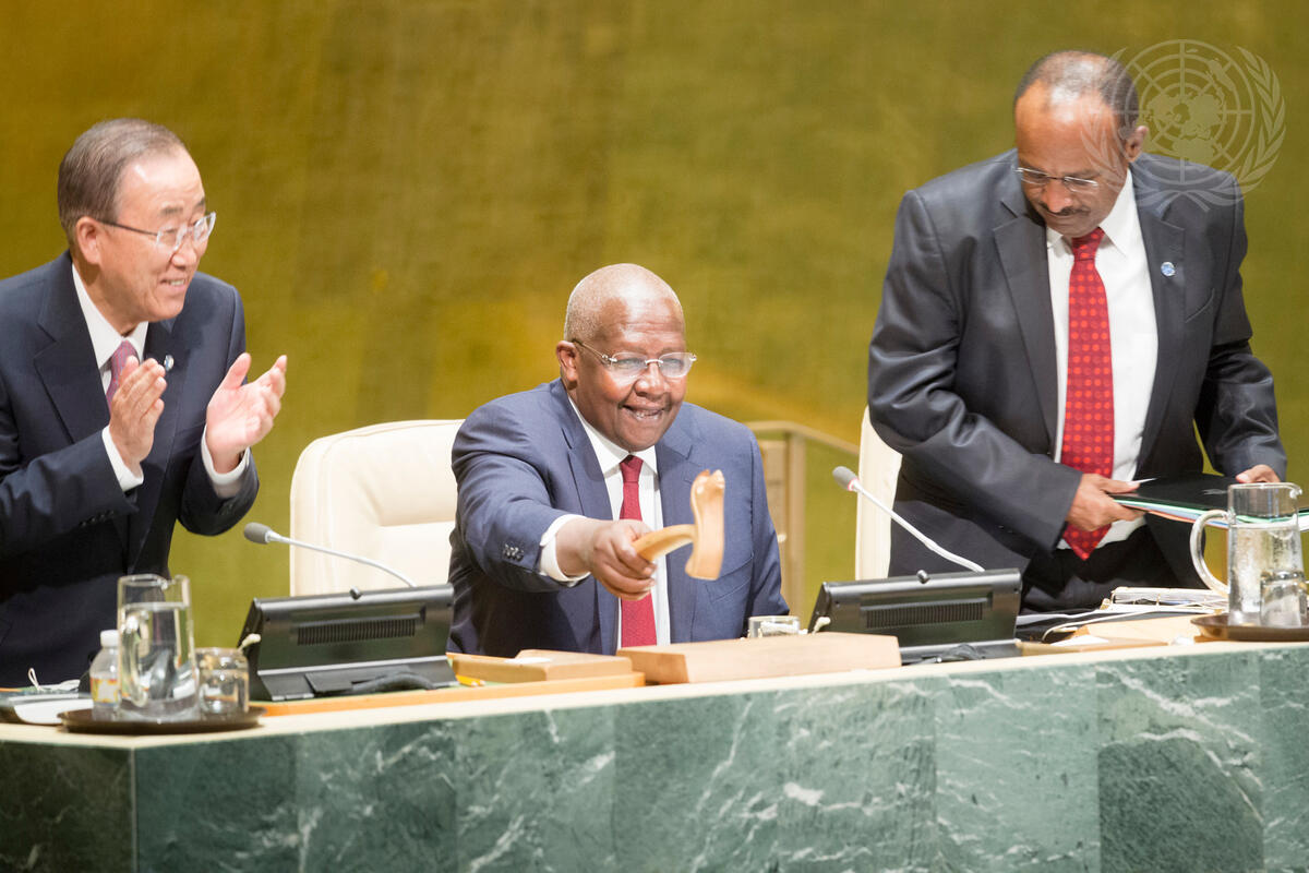 Sam Kutesa (centre), President of the sixty-ninth session of the General Assembly, gavels the session closed. He is flanked by Secretary-General Ban Ki-moon (left) and Tegegnework Gettu, Under-Secretary-General for General Assembly and Conference Management.
