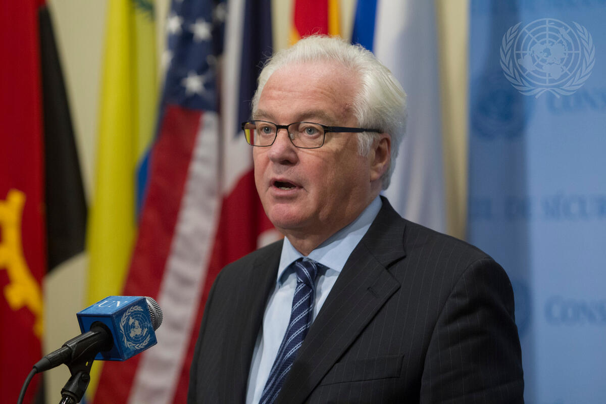 Vitaly I. Churkin, Permanent Representative of the Russian Federation to the UN and President of the Security Council for September, speaks to journalists following a closed-door Council meeting on the situation in South Sudan.