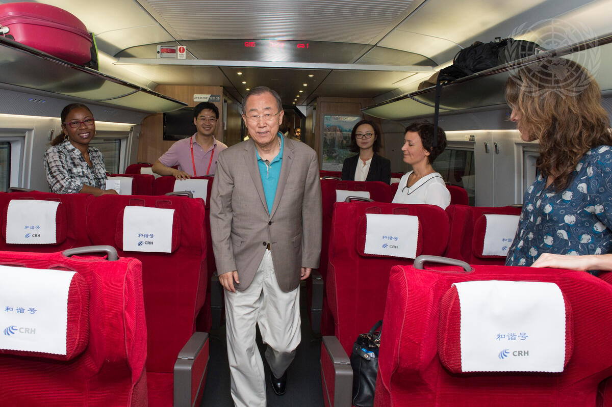 Secretary-General Ban Ki-moon (centre) departs from Beijing via bullet train to Tai'an.