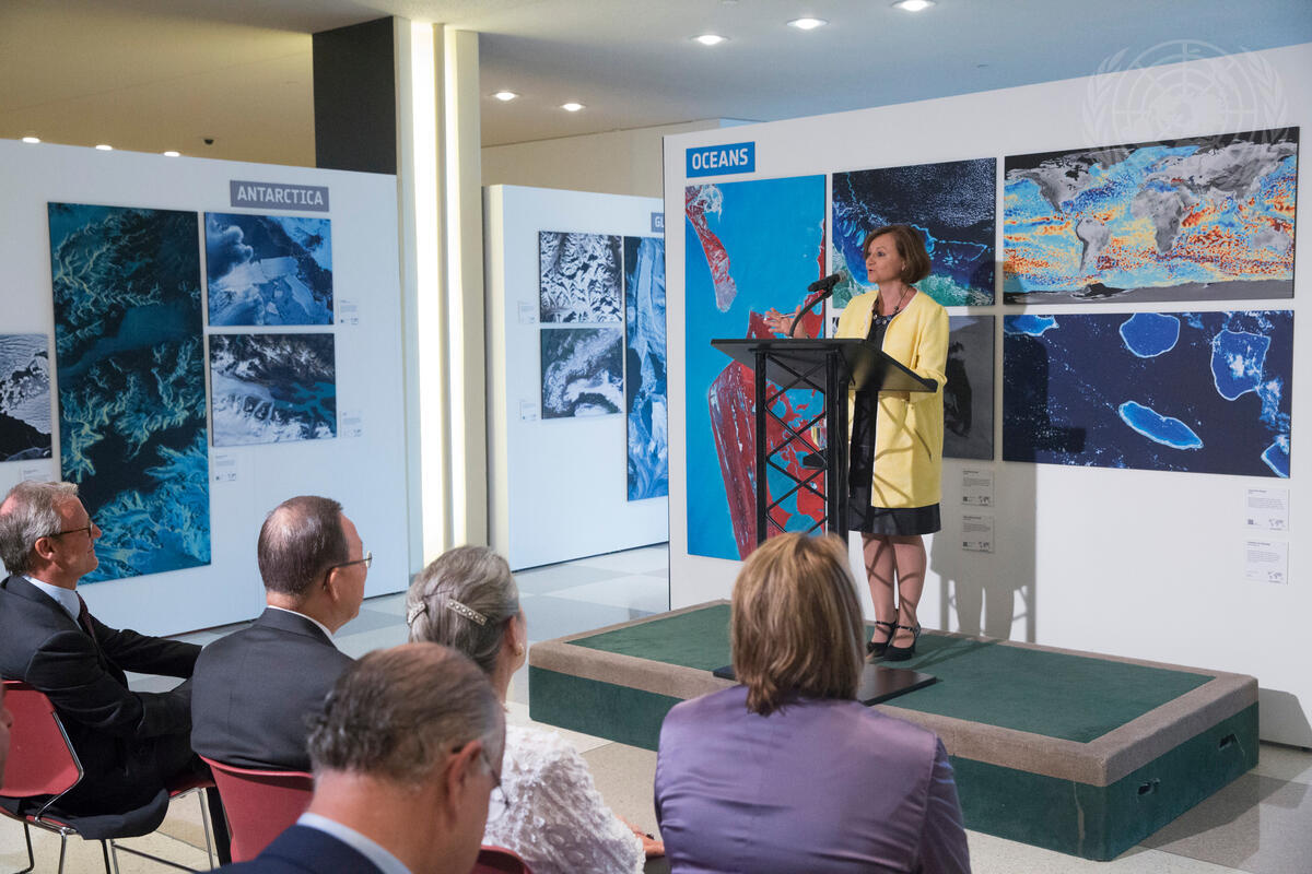 Cristina Gallach, Under-Secretary-General for Communications and Public Information, speaks at the closing ceremony of the exhibition “My Planet From Space: Fragility and Beauty”. Coordinated and produced by the European Space Agency (ESA) and realized in close partnership with the United Nations Office for Outer Space Affairs (UNOOSA), the exhibit used spectacular satellite images and videos to demonstrate the beauty and fragility of the Earth and the challenges posed by climate change. It ran at the Visitors’ Lobby of the General Assembly Building for two months.